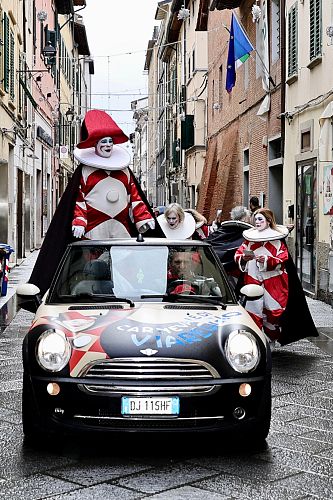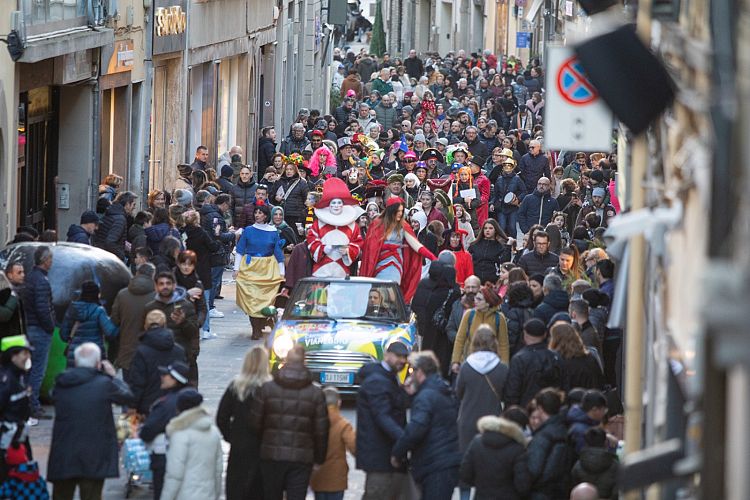 A guidare la parata nel centro cittadino, la mascherata di gruppo dell'artigiano della cartapesta del Carnevale di Viareggio Silvano Bianchi che dà il nome al Carnevale di quest'anno, ‘Insieme sotto lo stesso cielo’, poi i figuranti della Compagnia di Sant’Andrea coi costumi a tema carnevalesco, realizzati dalle preziose sarte dell’Auser Filo d’Argento.