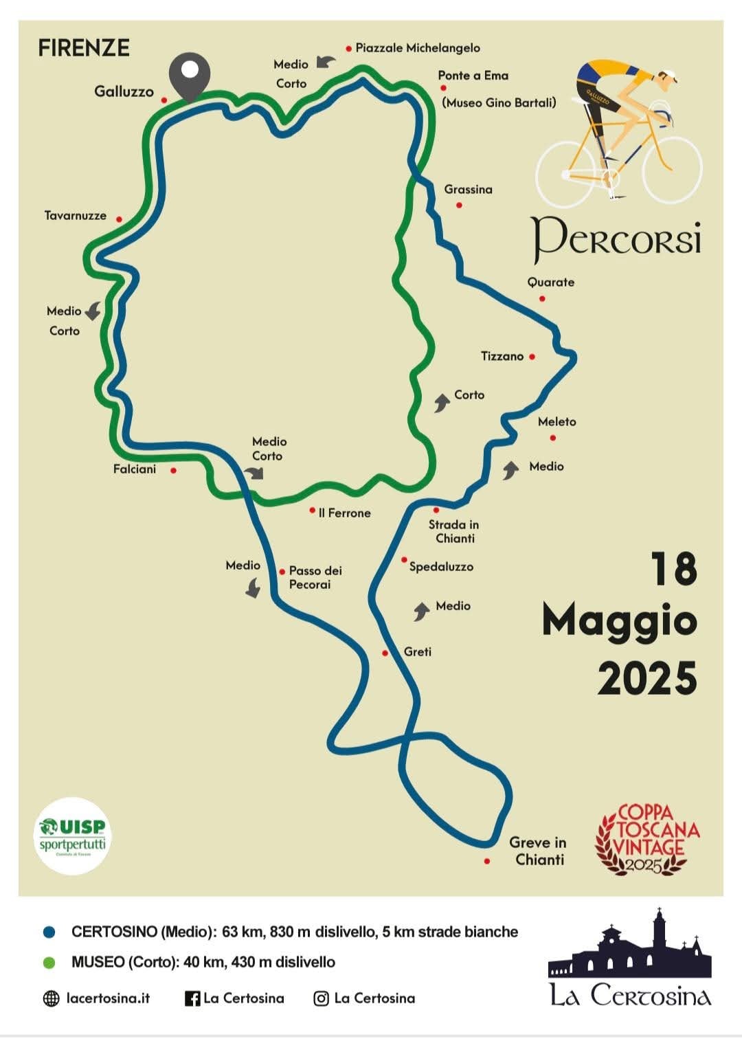 La Certosina 2025, VIII edizione, IV tappa Coppa Toscana Vintage ciclostoriche, Memorial Gaetano Ceccatelli, organizzata dalla Misericordia del Galluzzo è in programma al Galluzzo (FI) il 18 maggio con partenza ore 09.00. LE ISCRIZIONI SOLO ON-LINE SI SONO CHIUSE LUNEDI 12 MAGGIO.