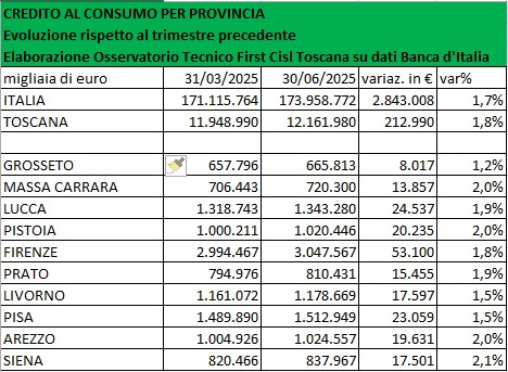 Nel secondo trimestre del 2025 anche in Toscana continua la crescita del credito al consumo e ad un ritmo leggermente superiore a quello nazionale.In Italia il volume complessivo dei finanziamenti è aumentato dell’1,7% rispetto al trimestre precedente, passando da 171,115 miliardi di euro a fine marzo a 173,958 miliardi a fine giugno.