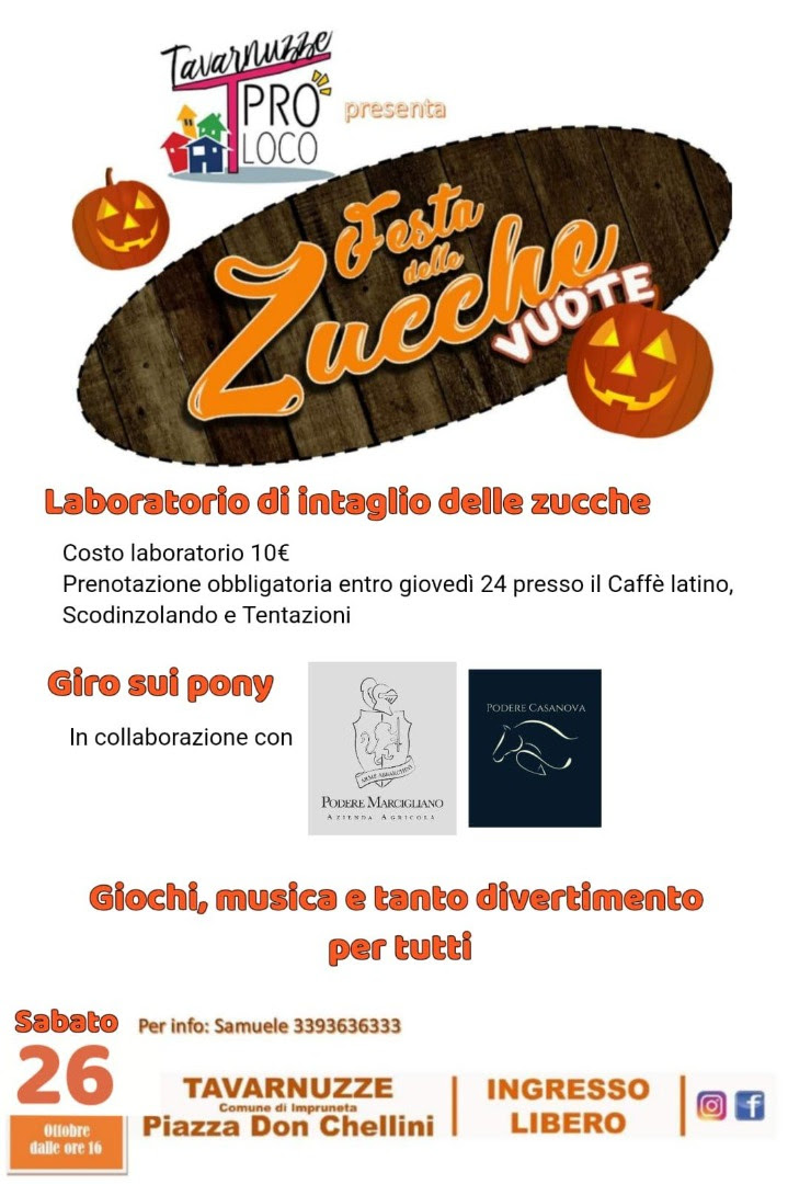 Impruneta (Firenze) 22 Ottobre 2024 | Sabato 26 ottobre, la Proloco di Tavarnuzze organizza un pomeriggio di festa per famiglie e bambini in Piazza Don Chellini: la Festa delle Zucche Vuote. L'evento, che celebra l'arrivo dell'autunno e anticipa le festività di Halloween, offrirà una serie di attività per grandi e piccoli.