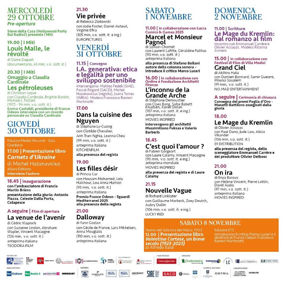 Dal 30 ottobre al 2 novembre 2025, con pre-apertura speciale il 29 ottobre, Firenze accoglie la diciassettesima edizione di France Odeon, il festival del cinema francese contemporaneo diretto da Francesco Ranieri Martinotti, organizzato con il sostegno del MiC, Regione Toscana e in collaborazione con l’Ambasciata di Francia in Italia e Institut français Italia e di Firenze, è parte del cartellone della rassegna di festival internazionali, "50 Giorni di Cinema a Firenze". Le proiezioni si svolgeranno presso il cinema La Compagnia, cuore pulsante della manifestazione, con appuntamenti speciali anche a Palazzo Medici Riccardi.