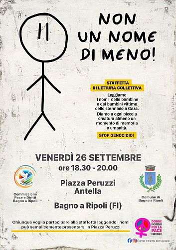 Nome dopo nome, le bambine e i bambini palestinesi uccisi a Gaza saranno ricordati per chiedere lo stop al massacro con una staffetta di lettura collettiva. L’iniziativa, dal titolo “Non un nome di meno!”, promossa dalla Commissione comunale per la Pace e i diritti di Bagno a Ripoli, si svolgerà venerdì 26 settembre dalle 18.30 alle 20.00 in piazza Peruzzi all’Antella. La staffetta di lettura ideata dall'associazione Donne Insieme per la Pace di Firenze è partita il 2 settembre da piazza Signoria a Firenze e sta coinvolgendo sempre più comuni fiorentini e toscani.