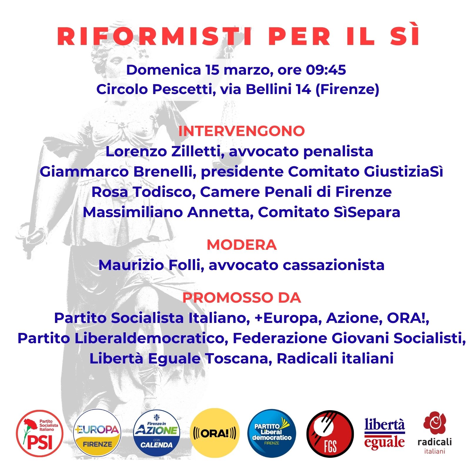 Domenica 15 marzo, alle ore 9:45, presso il Circolo Pescetti (via Bellini 14), si terrà l’iniziativa pubblica “Riformisti per il Sì”, un evento che riunisce le forze politiche di opposizione decise a sostenere il merito della riforma della giustizia e il prossimo appuntamento referendario. L’iniziativa nasce dalla convergenza di +Europa, PSI, Azione, PLD, ORA!, Libertà Eguale, Radicali italiani e Federazione Giovani Socialisti. Una coalizione di forze che, pur confermando la netta distanza politica dall’agire del Governo Meloni, rifiuta la logica del “no” acritico e ideologico.