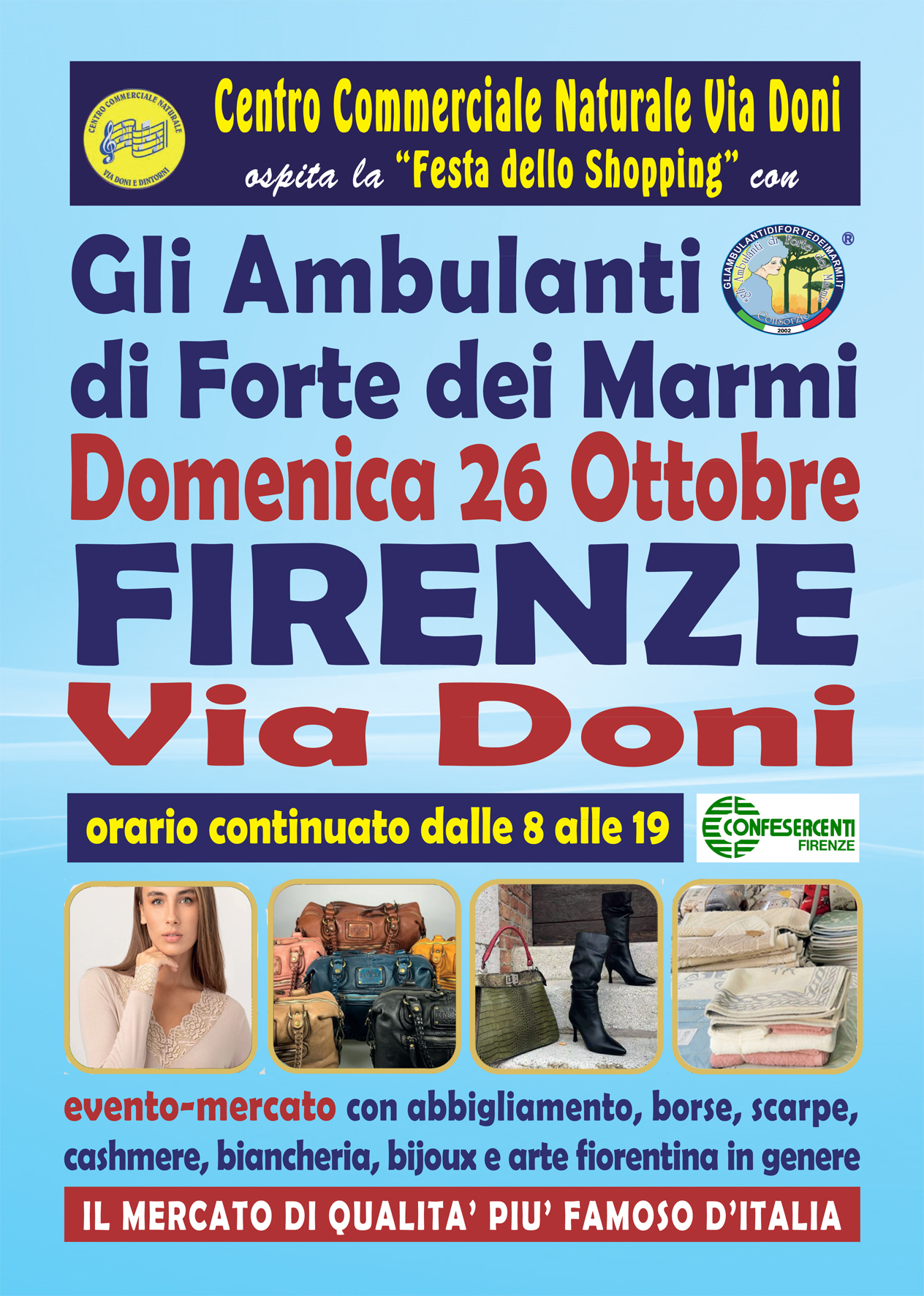 Gli Ambulanti di Forte dei Marmi®,le bancarelle del mercato di qualità più famoso d’Italia, da non confondere con alcuni tentativi di imitazione del loro originale format che circolano in regione, tornano per l’autunno a grandissima richiesta in città, grazie alla collaborazione con il Centro Commerciale Naturale di Via Doni,con il loro show itinerante all’insegna del meglio del Made in Italy artigianale e delle ultime tendenze della moda.
