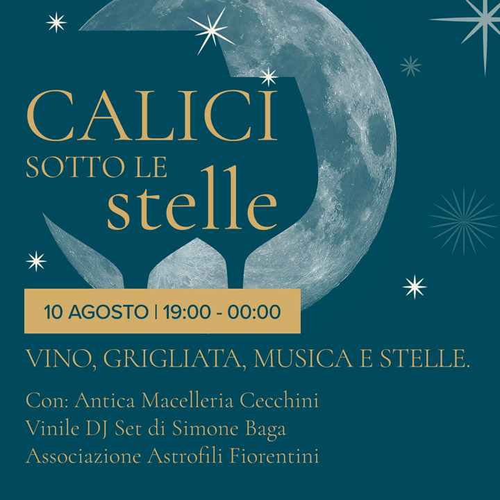 La serata si svolgerà il 10 Agosto, con inizio alle 19.00, sulla terrazza panoramica che si affaccia sui vigneti della Tenuta di Nozzole per ammirare il tramonto e si protrarrà fino a mezzanotte sotto il cielo stellato di San Lorenzo.Protagonisti saranno i vini delle più importanti denominazioni toscane dell’azienda Ambrogio e Giovanni Folonari Tenute con degustazione libera tra la selezione di etichette proposte, accompagnati dalle specialità dell’Antica Macelleria Cecchini che curerà l’aperitivo seguito da una gustosa grigliata di carne cucinata a vista.