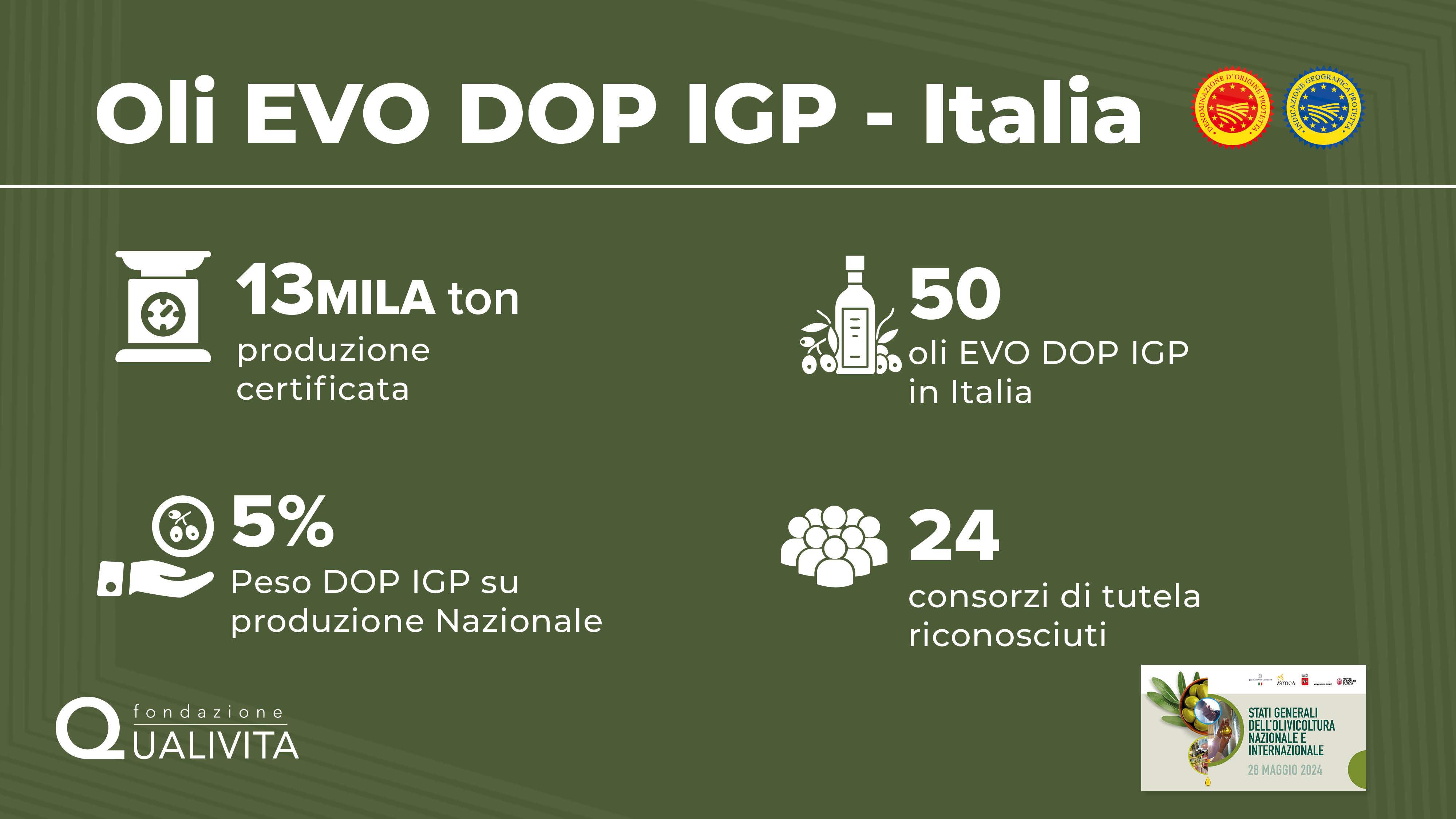 Sono 50 le DOP IGP dell’olio extravergine d’oliva in Italia, numeri da primato europeo. Dai terrazzamenti liguri alle colline umbre o toscane, dalle piane pugliesi alle valli siciliane, dalle pendici dei monti abruzzesi ai laghi lombardi, l’extravergine d’oliva italiano si esprime con oltre 500 varietà di olive. I 24 Consorzi di tutela riconosciuti dal Ministero dell’agricoltura, della sovranità alimentare e delle foreste coordinano il lavoro di circa 23.500 operatori impiegati nel settore. Tuttavia, come detto, la produzione certificata DOP IGP equivale oggi al 5% della produzione totale nazionale, con un grande potenziale di crescita che potrebbe rappresentare il fattore chiave per il rilancio di una vera filiera italiana e la lotta all’ibericizzazione.
